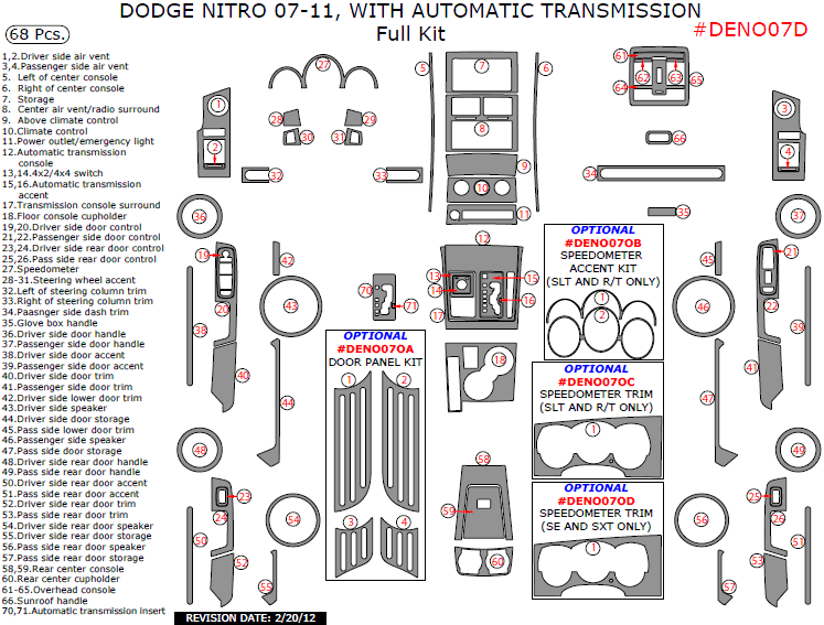 We offer a wide variety of colors and materials of Dodge Nitro 2007, 2008, 2009, 2010, 2011, With Automatic Transmission, Full Interior Kit, 68 Pcs. Choose your favourite option and place an order.