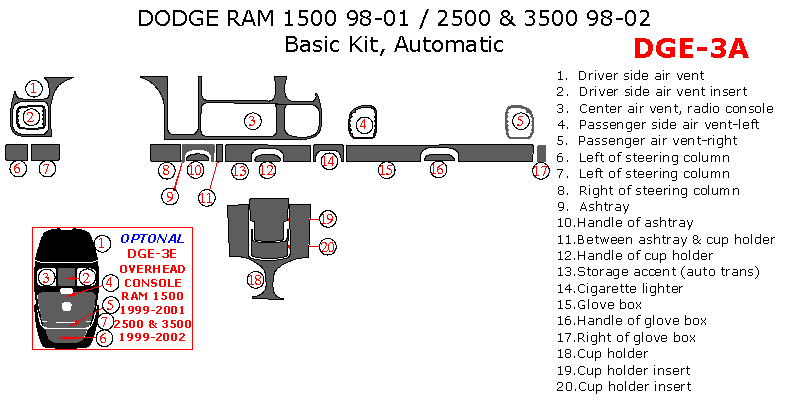 We offer a wide variety of colors and materials of Dodge RAM 1500 (1998, 1999, 2000, 2001), RAM 2500/3500 (1998, 1999, 2000, 2001, 2002), Basic Interior Kit, Auto, 20 Pcs. Choose your favourite option and place an order.