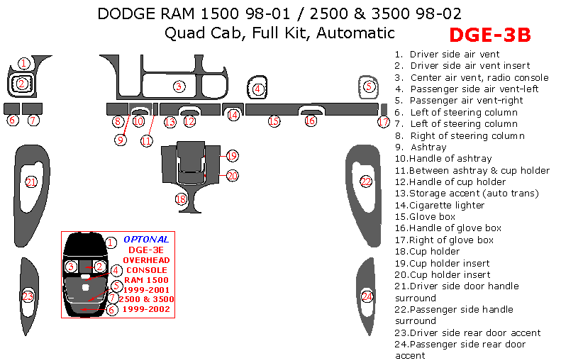 Dodge RAM 1500 1998, 1999, 2000, 2001, RAM 2500/3500 1998-1, 2002, Quad Cab, Full Interior Kit, Auto, 24 Pcs.