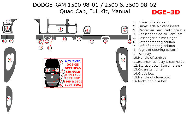 We offer a wide variety of colors and materials of Dodge RAM 1500 (1998, 1999, 2000, 2001), RAM 2500/3500 (1998, 1999, 2000, 2001, 2002), Quad Cab, Full Interior Kit, Manual, 20 Pcs. Choose your favourite option and place an order.