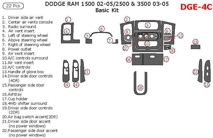 Dodge RAM 1500 2002, 2003, 2004, 2005, RAM 2500/3500 2003-2005, Basic Interior Kit, 2&4 Door, 22 Pcs.