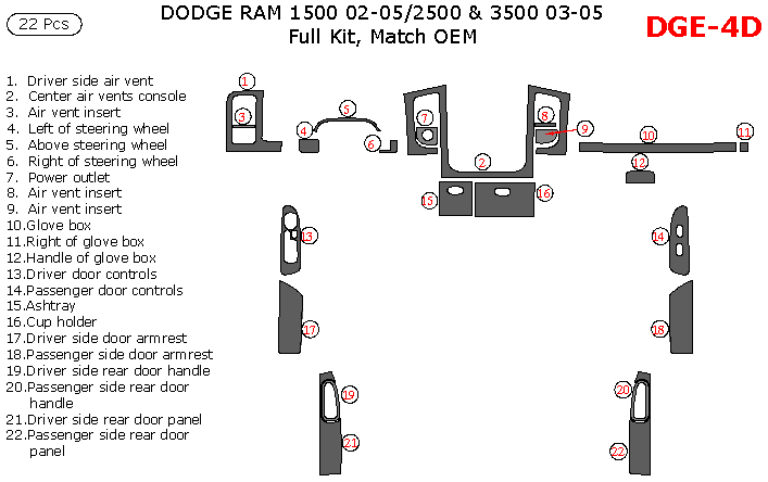 Dodge RAM 1500 2002, 2003, 2004, 2005, RAM 2500/3500 2003-2005, Full Interior Kit, 4 Door, 22 Pcs., OEM Match.