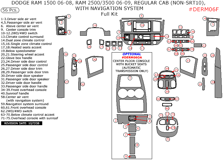 Dodge Ram 1500 2006, 2007, 2008, Ram 2500/3500 2006-2009, Regular Cab (non-SRT10),With Navigation System, Full Interior Kit, 56 Pcs.