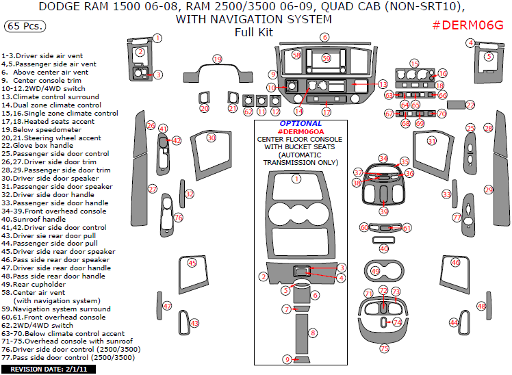 We offer a wide variety of colors and materials of Dodge Ram 1500 (2006, 2007, 2008), Ram 2500/3500 (2006, 2007, 2008, 2009), Quad Cab (non-SRT10),With Navigation System, Full Interior Kit, 65 Pcs. Choose your favourite option and place an order.