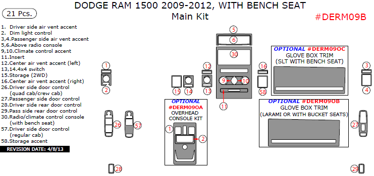 Dodge RAM 1500 2009, 2010, 2011, 2012, With Bench Seat, Main Interior Kit, 21 Pcs.