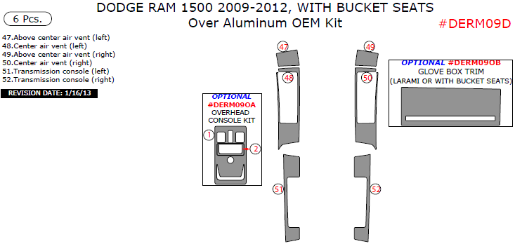 Dodge RAM 1500 2009, 2010, 2011, 2012, With Bucket Seats, Over Aluminum OEM Interior Kit, 6 Pcs.