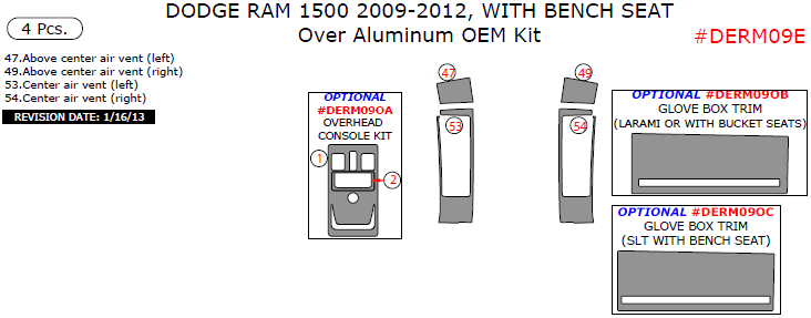 Dodge RAM 1500 2009, 2010, 2011, 2012, With Bench Seat, Over Aluminum OEM Interior Kit, 4 Pcs.