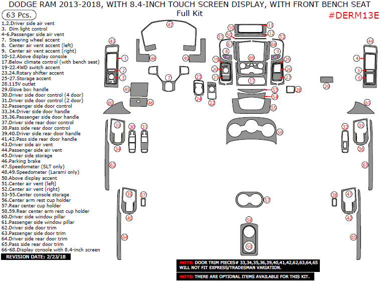 Dodge RAM 1500 2013, 2014, 2015, 2016, 2017, 2018, With 8.4-Inch Touch Screen Display, With Front Bench Seat, Full Interior Kit, 63 Pcs.