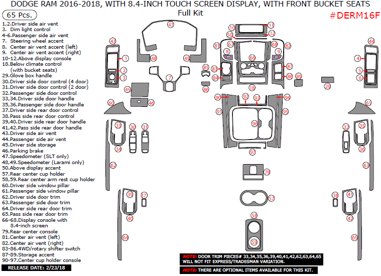 Dodge RAM 2016-2018, With 8.4-Inch Touch Screen Display, With Front Bucket Seats, Full Kit, 65 Pcs. Please Select Color RBA - Real Brushed Aluminum / add 15% RBBCF - Real Blue & Black Carbon Fiber / add 30% RC - Real Chrome RCF - Real Carbon Fiber / add 30% RDBCF - Real Dark Blue Carbon Fiber / add 30% RDMW - Real Dark Mahogany Wood (Non Stock Color) / add 30% RJCW - Real Japanese Cherry Wood / add 30% RMBW - Real Medium Burl Wood (Non Stock Color) / add 30% ROCF - Real Orange Carbon Fiber / add 30% RPW - Real Platinum Wood / add 30% RRBCF - Real Red & Black Carbon Fiber / add 30% RRCF - Real Red Carbon Fiber / add 30% RRW - Real Rosewood / add 30% RSWCF - Real Silver Wire Carbon Fiber / add 30% RWBW - Real Walnut Burl Wood (Non Stock Color) / add 30% RYBCF - Real Yellow & Black Carbon Fiber / add 30% RYCF - Real Yellow Carbon Fiber / add 30% SA - Aluminum (Non Stock Color) SAZW - African Zebra Wood SBA - Brushed Aluminum SBEW - Birdseye Wood (Non Stock Color) SBLACK - Black (Non Stock Color) SBLUE - Blue (Non Stock Color) SCF - Carbon Fiber SDBW - Dark Burl Wood SDESERT - Desert Camo (Non Stock Color) SDMW - Dark Mahogany Wood (Non Stock Color) SDZW - Dark Zebra Wood (Non Stock Color) SEZW - Ebony Zebra Wood (Non Stock Color) SFOREST - Forest Camo (Non Stock Color) SHBW - Honey Burl Wood SJCW - Japanese Cherry Wood (Non Stock Color) SMBW - Medium Burl Wood SNBW - Newport Burl Wood SORANGE - Orange (Non Stock Color) SPINK - Pink (Non Stock Color) SPW - Platinum Burl Wood SRED - Red (Non Stock Color) STBW - Titanium Burl Wood SWBW - Walnut Burl Wood (Non Stock Color) SWHITE - White (Non Stock Color) SYELLOW - Yellow (Non Stock Color) Item #:DERM16F Random Image. Example only. See diagram $526.28 - $684.16 Price as configured: $526.28 MANUFACTURING TIME 5-7 BUSINESS DAYS FREE SHIPPING TO CONTINENTAL USA Add to Cart Add to Wishlist Price as configured: $605.22 Item #: DERM16F Add to Cart Random Image. Example only. See diagram RBA - Real Brushed Aluminum RBBCF - Real Blue & Black Carbon Fiber RC - Real Chrome RCF - Real Carbon Fiber RDBCF - Real Dark Blue Carbon Fiber RDMW - Real Dark Mahogany Wood (Non Stock Color) RJCW - Real Japanese Cherry Wood RMBW - Real Medium Burl Wood (Non Stock Color) ROCF - Real Orange Carbon Fiber RPW - Real Platinum Wood RRBCF - Real Red & Black Carbon Fiber RRCF - Real Red Carbon Fiber RRW - Real Rosewood RSWCF - Real Silver Wire Carbon Fiber RWBW - Real Walnut Burl Wood (Non Stock Color) RYBCF - Real Yellow & Black Carbon Fiber RYCF - Real Yellow Carbon Fiber SA - Aluminum (Non Stock Color) SAZW - African Zebra Wood SBA - Brushed Aluminum SBEW - Birdseye Wood (Non Stock Color) SBLACK - Black (Non Stock Color) SBLUE - Blue (Non Stock Color) SCF - Carbon Fiber SDBW - Dark Burl Wood SDESERT - Desert Camo (Non Stock Color) SDMW - Dark Mahogany Wood (Non Stock Color) SDZW - Dark Zebra Wood (Non Stock Color) SEZW - Ebony Zebra Wood (Non Stock Color) SFOREST - Forest Camo (Non Stock Color) SHBW - Honey Burl Wood SJCW - Japanese Cherry Wood (Non Stock Color) SMBW - Medium Burl Wood SNBW - Newport Burl Wood SORANGE - Orange (Non Stock Color) SPINK - Pink (Non Stock Color) SPW - Platinum Burl Wood SRED - Red (Non Stock Color) STBW - Titanium Burl Wood SWBW - Walnut Burl Wood (Non Stock Color) SWHITE - White (Non Stock Color) SYELLOW - Yellow (Non Stock Color) Description Additional information Reviews (0) CUSTOMER REVIEWS 0 ITEM(S) Add Your Review Let us know your thoughts * Summary of Your Review* What's your nickname?* Submit Review Description Additional information Reviews (0) CUSTOMER REVIEWS 0 ITEM(S) Add Your Review Let us know your thoughts * Summary of Your Review* What's your nickname?* Submit Review California Residents Warning Cancer and Reproductive Harm. www.p65warnings.ca.gov Other products $44.79 DECN01OA Chrysler Town & Country / Dodge Caravan 2001, 2002, 2003, 2004, 2005, 2006, 2007, Interior Kit, Optional Overhead Console With Message Center, 1 Pcs. more $50.39 DECR11OA Chrysler 300 2011, 2012, 2013, 2014, 2015, 2016, 2017, 2018, 2019, 2020, 2021, 2022, 2023 / Dodge Charger 2011-2023, Optional Overhead Console Interior Kit, 9 Pcs. more $83.99 S-DECN08A Dodge Caravan/Chrysler Town & Country 2008, 2009, 2010, 2011, 2012, 2013, 2014, 2015/Volkswagen Routan 2009-up, Stainless Steel Pillar Posts, 4 Pcs. more $83.99 DECN01OB Chrysler Town & Country / Dodge Caravan 2001, 2002, 2003, 2004, 2005, 2006, 2007, Interior Kit, Optional Door Panels, Fit With Door Handles Type "B", 2 Pcs. more $156.77 X-DECN08B Chrysler Town & Country 2008, 2009, 2010, Dodge Caravan 2008, 2009, 2010, Volkswagen Routan 2009-up, Basic Exterior Kit, 6 Pcs. more $162.37 S-DECN08B Dodge Caravan/Chrysler Town & Country 2008, 2009, 2010, 2011, 2012, 2013, 2014, 2015/Volkswagen Routan 2009-up, Stainless Steel Pillar Posts, 6 Pcs. more RECENTLY VIEWED PRODUCTS Ford F-150 2015, 2016, 2017, 2018, 2019, 2020 For Models With Bucket Seats, With 4.2-Inch Screen Radio, Main Interior Kit, 58 Pcs. RBA - Real Brushed Aluminum RBBCF - Real Blue & Black Carbon Fiber RC - Real Chrome RCF - Real Carbon Fiber RDBCF - Real Dark Blue Carbon Fiber RDMW - Real Dark Mahogany Wood (Non Stock Color) RJCW - Real Japanese Cherry Wood RMBW - Real Medium Burl Wood (Non Stock Color) ROCF - Real Orange Carbon Fiber RPW - Real Platinum Wood RRBCF - Real Red & Black Carbon Fiber RRCF - Real Red Carbon Fiber RRW - Real Rosewood RSWCF - Real Silver Wire Carbon Fiber RWBW - Real Walnut Burl Wood (Non Stock Color) RYBCF - Real Yellow & Black Carbon Fiber RYCF - Real Yellow Carbon Fiber SA - Aluminum (Non Stock Color) SAZW - African Zebra Wood SBA - Brushed Aluminum SBEW - Birdseye Wood (Non Stock Color) SBLACK - Black (Non Stock Color) SBLUE - Blue (Non Stock Color) SCF - Carbon Fiber SDBW - Dark Burl Wood SDESERT - Desert Camo (Non Stock Color) SDMW - Dark Mahogany Wood (Non Stock Color) SDZW - Dark Zebra Wood (Non Stock Color) SEZW - Ebony Zebra Wood (Non Stock Color) SFOREST - Forest Camo (Non Stock Color) SHBW - Honey Bu