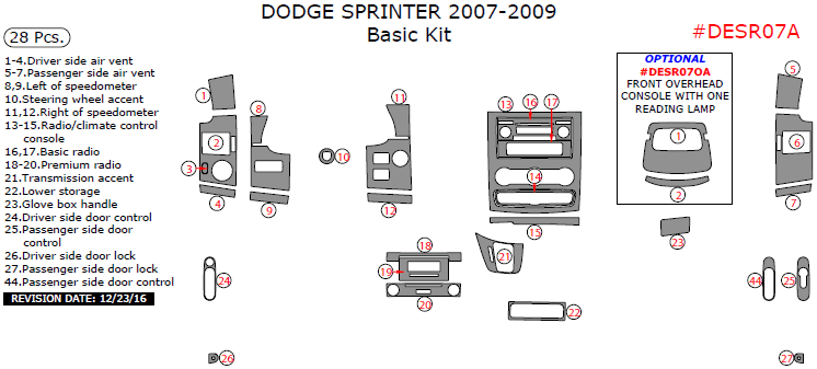 We offer a wide variety of colors and materials of Dodge Sprinter 2007, 2008, 2009, Basic Interior Kit, 28 Pcs. Choose your favourite option and place an order.