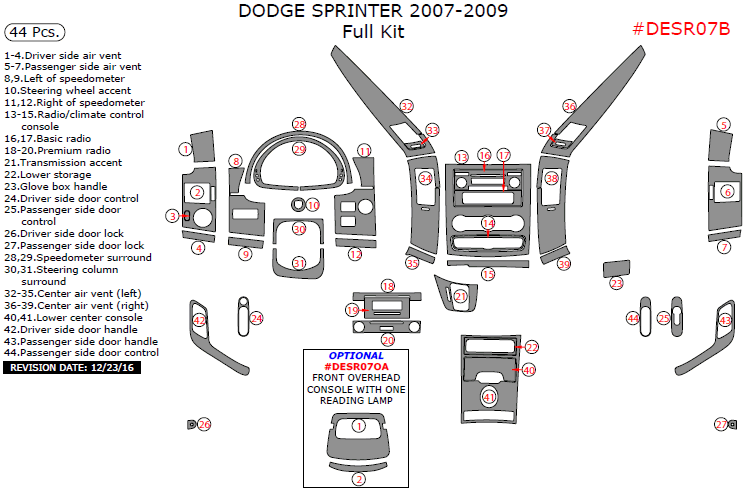 We offer a wide variety of colors and materials of Dodge Sprinter 2007, 2008, 2009, Full Interior Kit, 44 Pcs. Choose your favourite option and place an order.