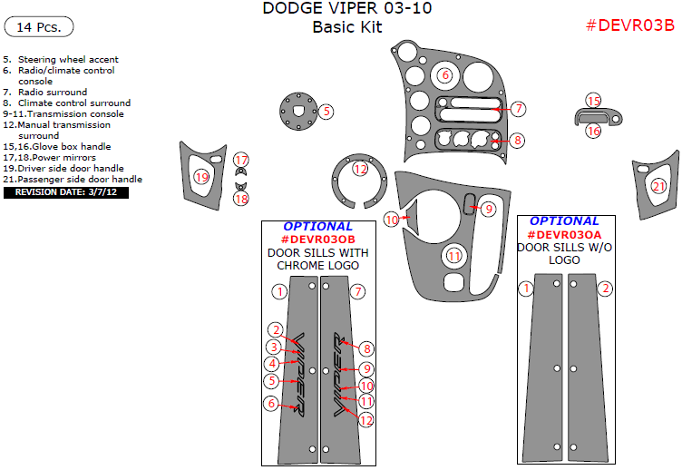 We offer a wide variety of colors and materials of Dodge Viper 2003, 2004, 2005, 2006, 2007, 2008, 2009, 2010, Basic Interior Kit, 14 Pcs. Choose your favourite option and place an order.