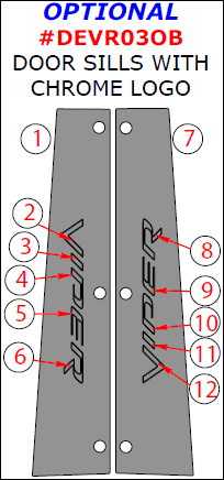 Dodge Viper 2003, 2004, 2005, 2006, 2007, 2008, 2009, 2010, Interior Kit, Optional Door Sills With Chrome Logo, 12 Pcs.