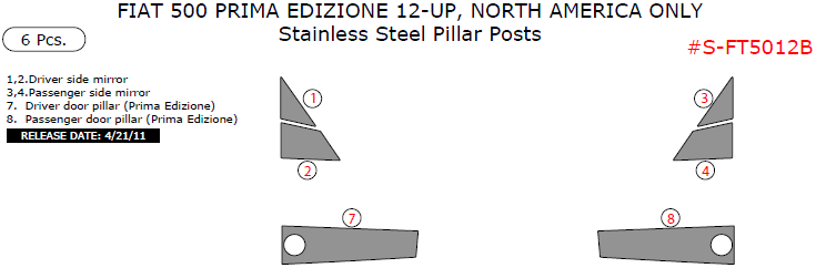 Fiat 500 Prima Edizione 2012, 2013, 2014, 2015, Stainless Steel Pillar Posts (North America Only), 6 Pcs.