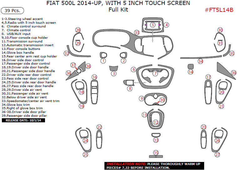 Fiat 500L 2014, 2015, 2016, 2017, With 5 Inch Touch Screen, Full Interior Kit, 39 Pcs.