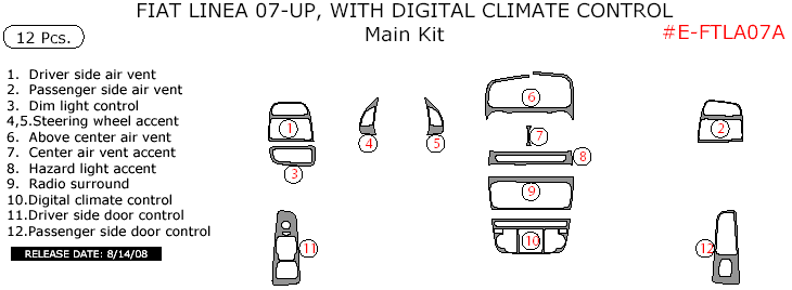 Fiat Linea 2007, 2008, 2009, 2010, 2011, 2012, 2013, 2014, 2015, With Digital Climate Control, Main Interior Kit, 12 Pcs.