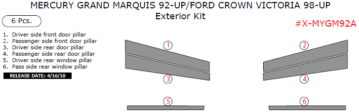 Ford Crown Victoria 1998, 1999, 2000, 2001, 2002, 2003, 2004, 2005, 2006, 2007, 2008, 2009, 2010, 2011, 2012, 2013, 2014, 2015, Mercury Grand Marquis 1992-up, Exterior Kit, 6 Pcs.