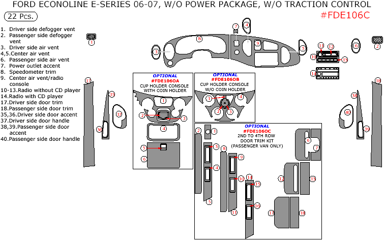 We offer a wide variety of colors and materials of Ford Econoline E-Series 2006-2007, Interior Dash Kit, W/o Power Package, W/o Traction Control, 22 Pcs. Choose your favourite option and place an order.