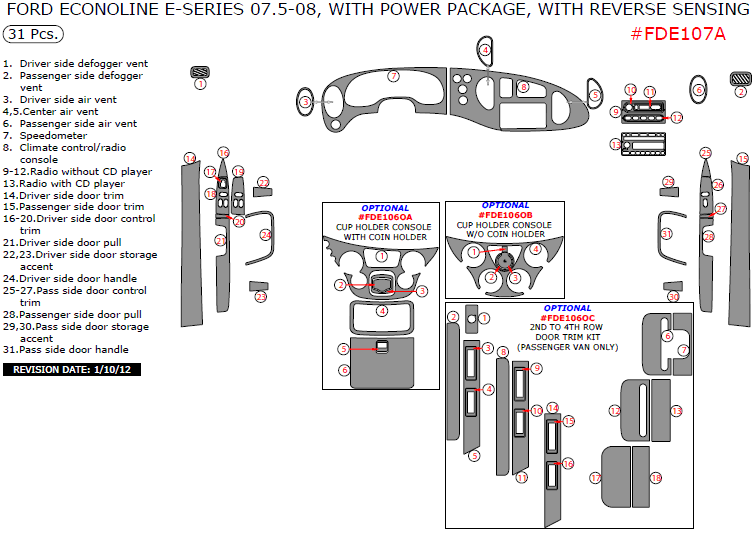 We offer a wide variety of colors and materials of Ford Econoline E-Series 2007.5-2008, Interior Dash Kit, With Power Package, With Reverse Sensing, 31 Pcs. Choose your favourite option and place an order.