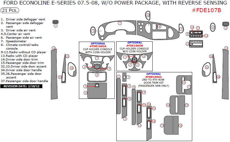 We offer a wide variety of colors and materials of Ford Econoline E-Series 2007.5-2008, Interior Dash Kit, W/o Power Package, With Reverse Sensing, 21 Pcs. Choose your favourite option and place an order.