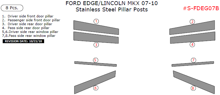 We offer a wide variety of colors and materials of Ford Edge/Lincoln MKX 2007, 2008, 2009, 2010, Stainless Steel Pillar Posts, 8 Pcs. Choose your favourite option and place an order.