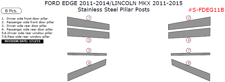 We offer a wide variety of colors and materials of Ford Edge 2011, 2012, 2013, 2014/Lincoln MKX 2011, 2012, 2013, 2014, 2015, Stainless Steel Pillar Posts, 8 Pcs. Choose your favourite option and place an order.