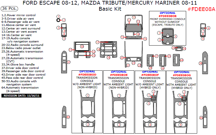 Ford Escape 2008, 2009, 2010, 2011, 2012, Mazda Tribute 2008-2011, Mercury Mariner 2008-2011, Basic Interior Kit, 36 Pcs.