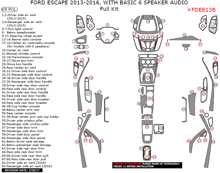 Ford Escape 2013, 2014, 2015, 2016, With Basic 6 Speaker Audio, Full Interior Kit, 69 Pcs.
