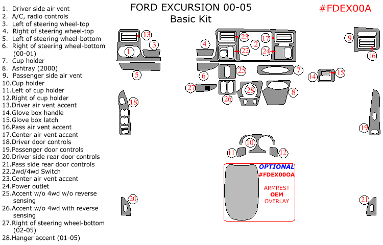 We offer full interior dash kit of 28 pieces in a wide variety of colors and materials (carbon fiber, wood, etc.) for Ford Excursion 2000, 2001, 2002, 2003, 2004, 2005. Choose your favourite option of 2000-2005 Ford Excursion interior accessory and place an order to buy the high-quality dash trim kit.