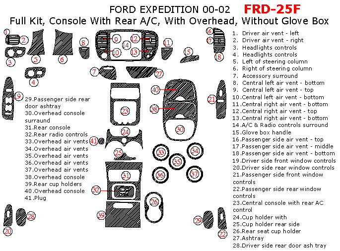 We offer a wide variety of colors and materials of Ford Expedition 2000, 2001, 2002, Full Interior Kit, With Overhead, Console With Rear AC, Without Glove Box,. 41 Pcs. Choose your favourite option and place an order.