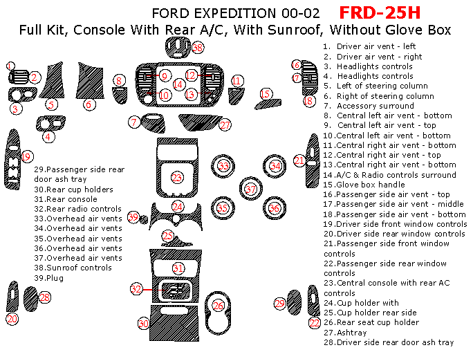 We offer a wide variety of colors and materials of Ford Expedition 2000, 2001, 2002, Full Interior Kit, With Sunroof, Console With Rear AC, Without Glove Box,. 39 Pcs. Choose your favourite option and place an order.