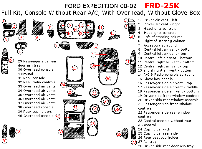 Ford Expedition 2000, 2001, 2002, Full Interior Kit, With Overhead, Console Without Rear AC, Without Glove Box, 40 Pcs.
