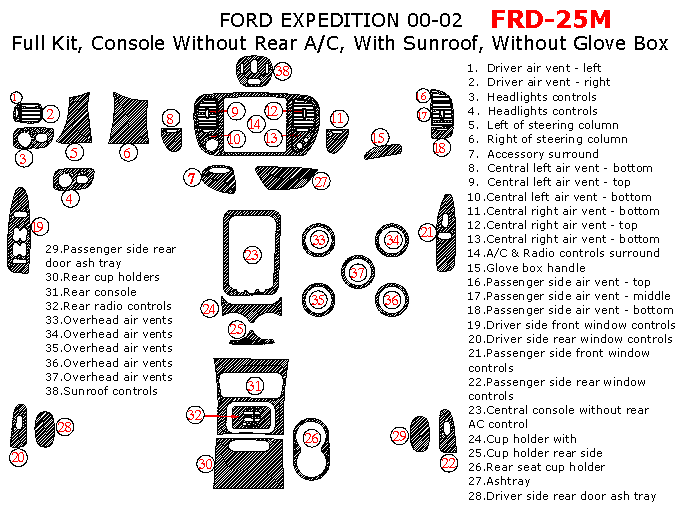 Ford Expedition 2000, 2001, 2002, Full Interior Kit, With Sunroof, Console Without Rear AC, Without Glove Box, 38 Pcs.