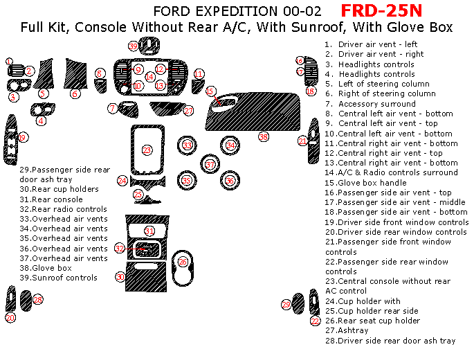 Ford Expedition 2000, 2001, 2002, Full Interior Kit, With Sunroof, Console Without Rear AC, With Glove Box, 39 Pcs.