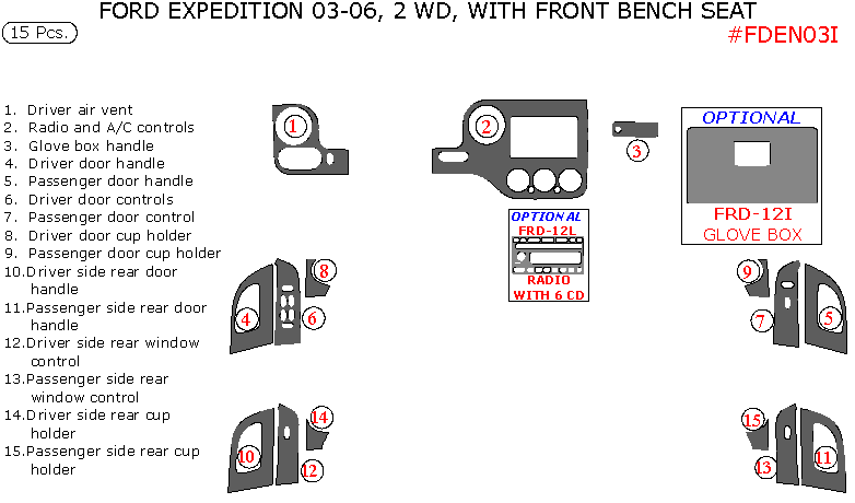 We offer a wide variety of colors and materials of Ford Expedition 2003, 2004, 2005, 2006, 2WD, Interior Dash Kit, Non-eddie Bauer Edition, With Front Bench Seat, 15 Pcs. Choose your favourite option and place an order.