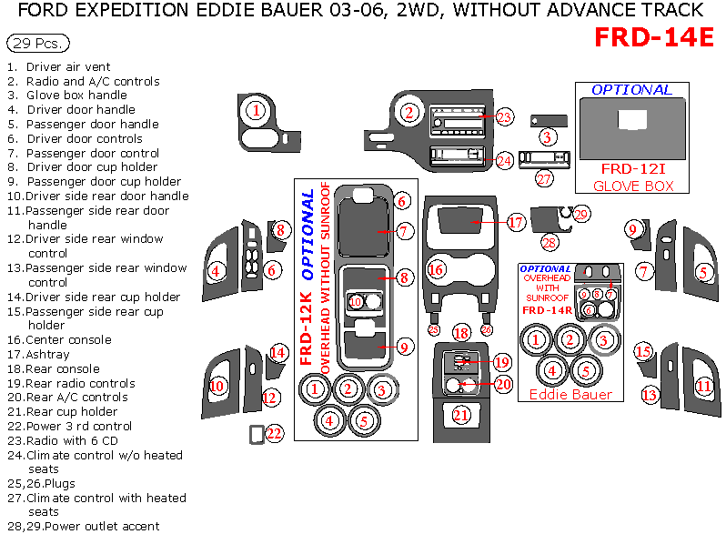 We offer a wide variety of colors and materials of Ford Expedition 2003, 2004, 2005, 2006, Interior Kit, Eddie Bauer Edition, Without Navigation, 2WD, Without Advance Track, 29 Pcs. Choose your favourite option and place an order.
