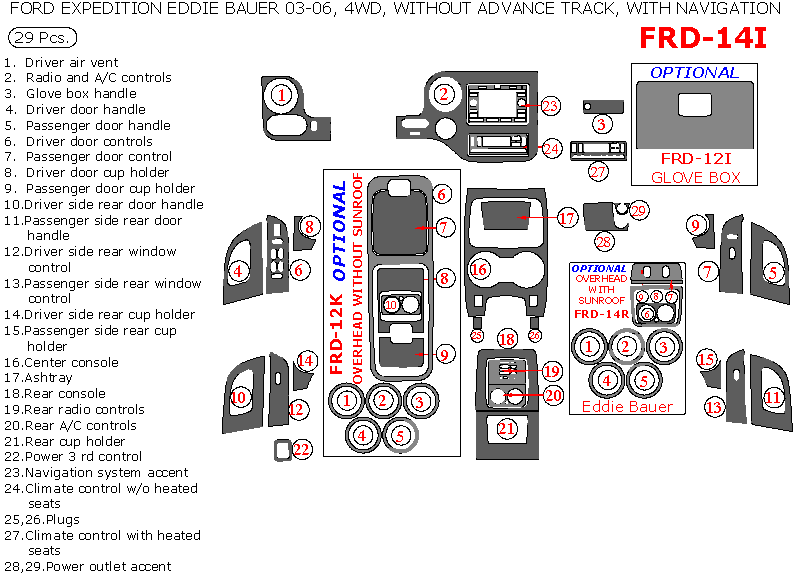 We offer a wide variety of colors and materials of Ford Expedition 2003, 2004, 2005, 2006, Interior Kit, Eddie Bauer Edition, With Navigation, 4WD, Without Advance Track, 29 Pcs. Choose your favourite option and place an order.
