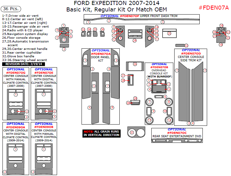 We offer a wide variety of colors and materials of Ford Expedition 2007, 2008, 2009, 2010, 2011, 2012, 2013, 2014, Regular Kit Or Match OEM, Basic Interior Kit, 36 Pcs. Choose your favourite option and place an order.