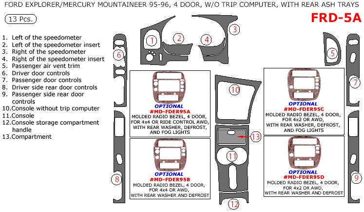 Ford Explorer 1995-1996, 4 Door, Full Interior Kit, Without Trip Computer, With Rear Ashtray, 13 Pcs.