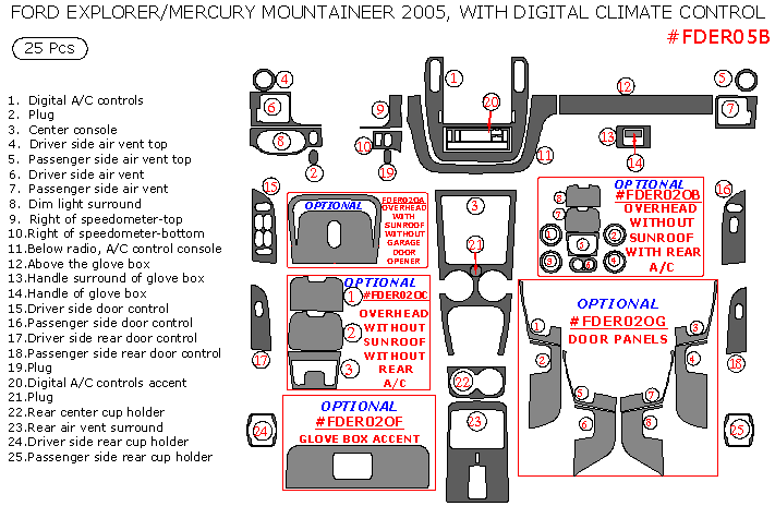 We offer a wide variety of colors and materials of Ford Explorer/Mercury Mountaineer 2005, Interior Dash Kit, With Digital Climate Control, 25 Pcs. Choose your favourite option and place an order.
