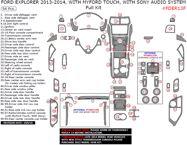 Ford Explorer 2013-2014, With MyFord Touch, With Sony Audio System, Full Interior Kit, 54 Pcs.