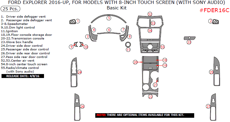 Ford Explorer 2016, 2017, For Models With 8-Inch Touch Screen (With Sony Audio), Basic Interior Kit, 25 Pcs.