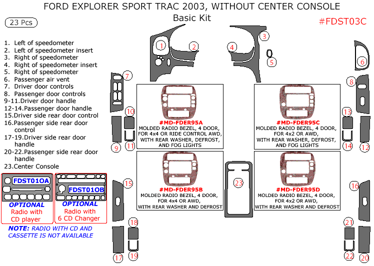 We offer a wide variety of colors and materials of Ford Explorer Sport Trac 2003, Basic Interior Kit, Without Center Console Interior Kit, 23 Pcs. Choose your favourite option and place an order.