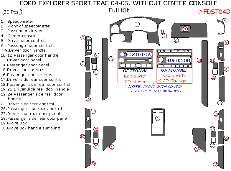 We offer a wide variety of colors and materials of Ford Explorer Sport Trac 2004-2005, Full Interior Kit, Without Center Console Interior Kit, 30 Pcs. Choose your favourite option and place an order.