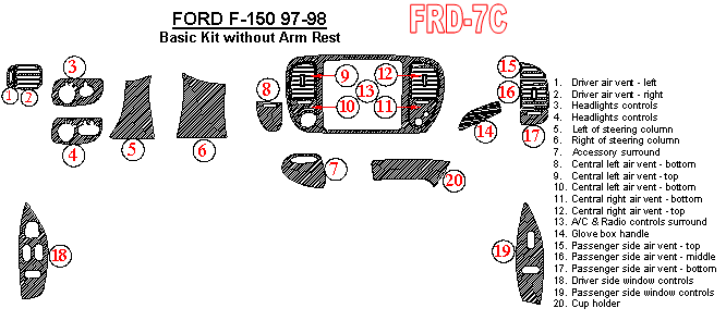 We offer a wide variety of colors and materials of Ford F-150 1997-1998, Interior Dash Kit, Without Armrest, 20 Pcs. Choose your favourite option and place an order.