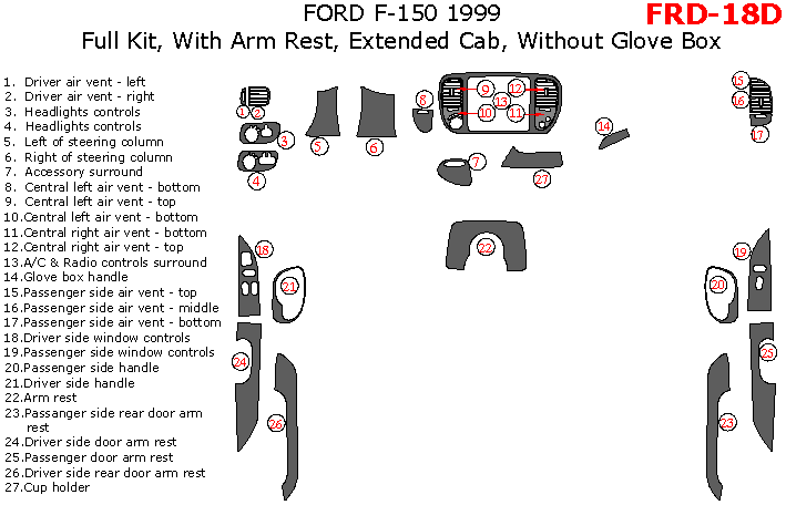 Ford F-150 1999, Extended Cab, Full Interior Kit, With Arm Rest, Extended Cab, Without Glove Box, 26 Pcs.