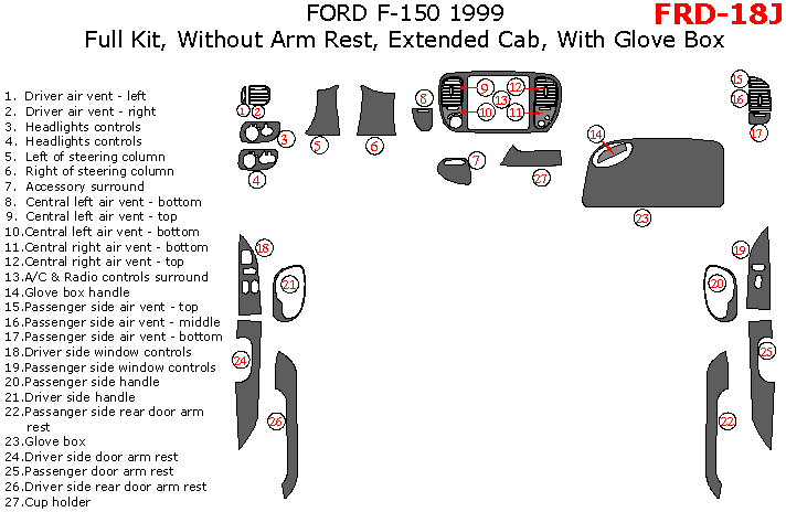 Ford F-150 1999, Extended Cab, Full Interior Kit, Without Arm Rest, Extended Cab, With Glove Box, 27 Pcs.
