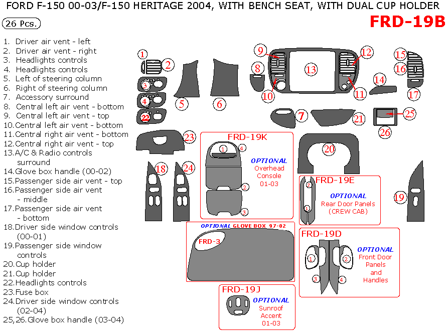 We offer a wide variety of colors and materials of Ford F-150 2000, 2001, 2002, 2003, Interior Dash Kit, Regular, With Bench Seat, With Dual Cup Holder, 26 Pcs. Choose your favourite option and place an order.