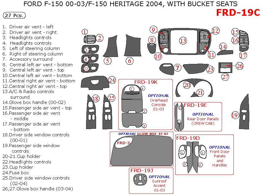 We offer a wide variety of colors and materials of Ford F-150 2000, 2001, 2002, 2003, Interior Dash Kit, Regular, With Bucket Seats, 27 Pcs. Choose your favourite option and place an order.