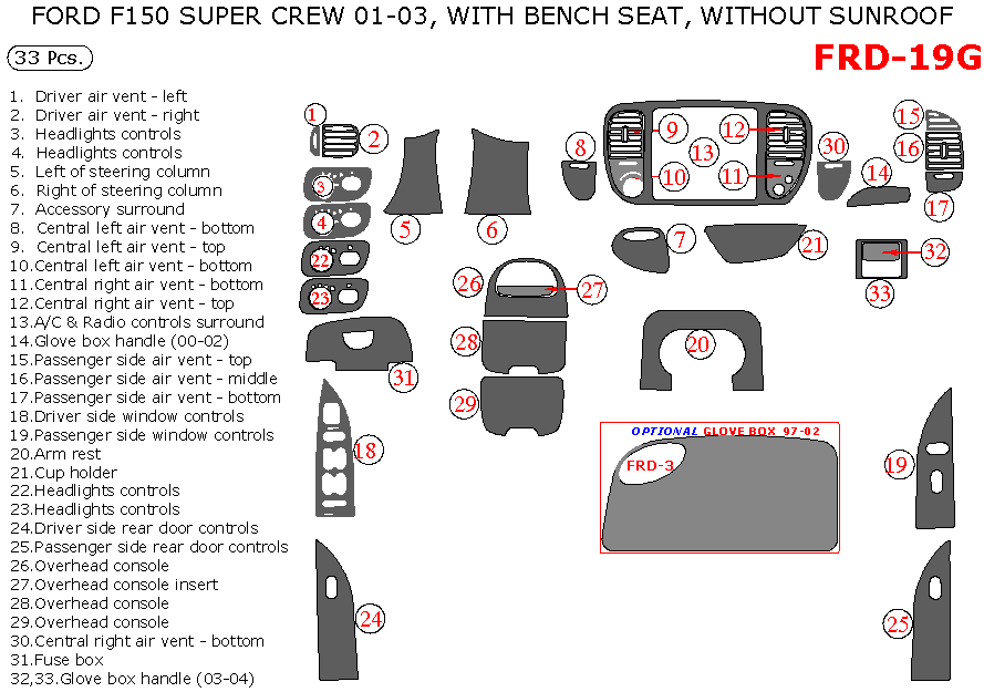 We offer a wide variety of colors and materials of Ford F-150 Supercrew 2000, 2001, 2002, 2003, Interior Dash Kit, With Bench Seat, Without Sunroof, 33 Pcs. Choose your favourite option and place an order.